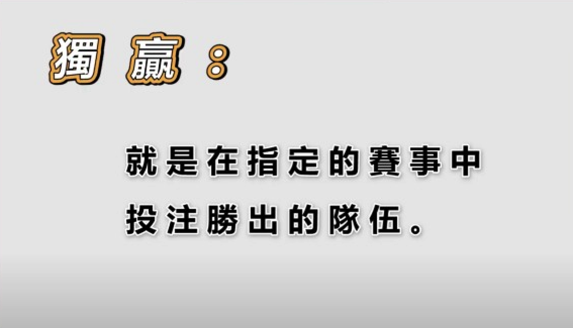 不讓分獨贏:最簡單的下注方式是選擇哪支球隊會贏得比賽,不需要考慮得分差距,只要選對一方球隊即可贏得獎金。